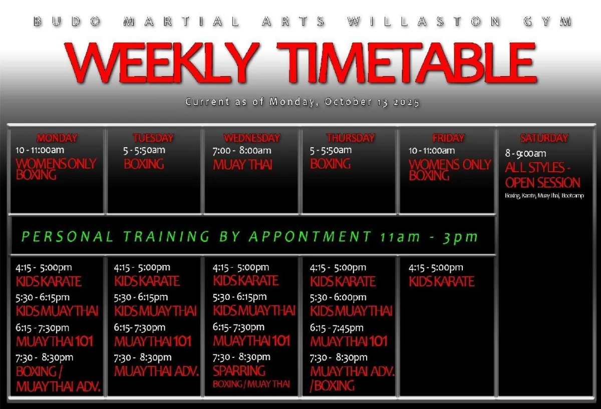 We offer a variety of martial arts disciplines, including Muay Thai, Karate, and Boxing. Each class is designed to cater to different skill levels and fitness goals.